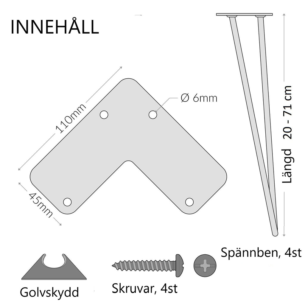 Uppsättning av 4 st klassiska Hairpin-bordsben med två stavar. Benen är tillverkade av stål vilket gör denna modell både stark och tålig. Med hög kvalitet på färg och finish står din förvaringsmöbel, bord eller sittbänk både stiligt och stabilt. Uppsättningen innehåller både skruvar för montering samt golvskydd.